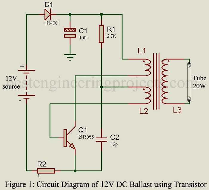 The project “12V DC Ballast” using power transistor 2N3055 is used to glow AC tube light using a DC source. The circuit of DC ballast is a DC-to-AC converter. DC ballast of various capacities (in watts) is already available in markets. The circuit posted here is of 20W capacity i.e. (it can drive a load up to 20 watts). Previously, we had posted Electronic Blast for Tube-light which drives load up to 40W, double the power of 12V DC Blast.