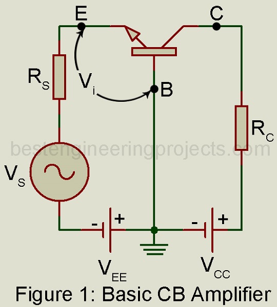 Figure 1 gives the basic circuit of a transistor (NPN type) used as a common base (CB) amplifier. In this case, Vs is the signal voltage, Vi is the actual voltage at the input terminals and V0 is the output voltage.