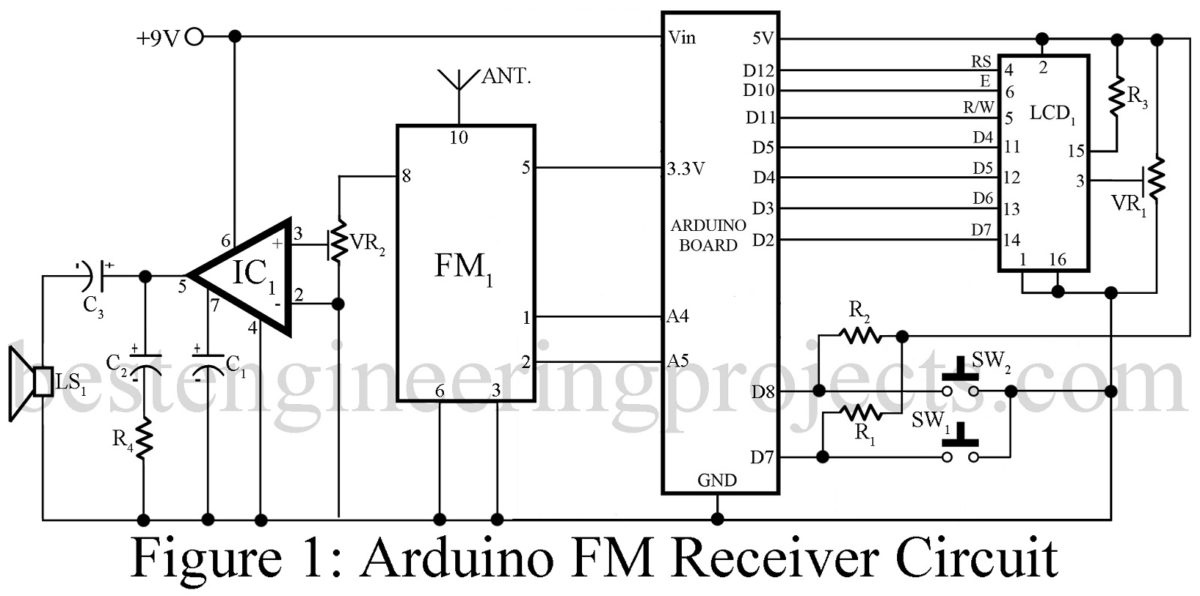 The circuit posted here is of Arduino FM Receiver using digital radio—receiver module TEA5657 by Philips. Additional components like audio power amplifier, Arduino uno board, and LCD module to display station number and frequency. However, for the receiving system to function flawlessly, external components like a capacitor, resistor, etc are included in the circuit, which is necessary. if you wish to make your FM transmitter circuit using Arduino please go through this link: Arduino FM Transmitter