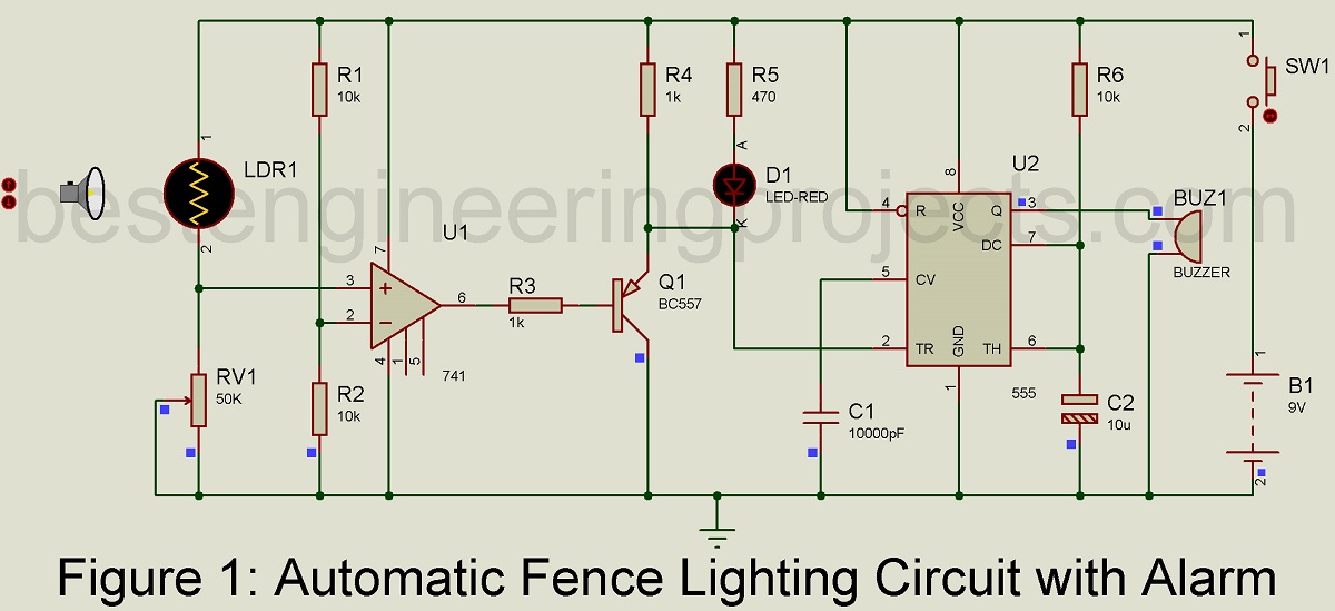 Today, in this article we are going to teach you how to make an automatic fence lighting circuit with an alarm using op-amp 741 and timer IC 555. Fence lighting is used for security purposes and can be used at various places like door alarms, pathway alarms, etc. where monitoring is required.