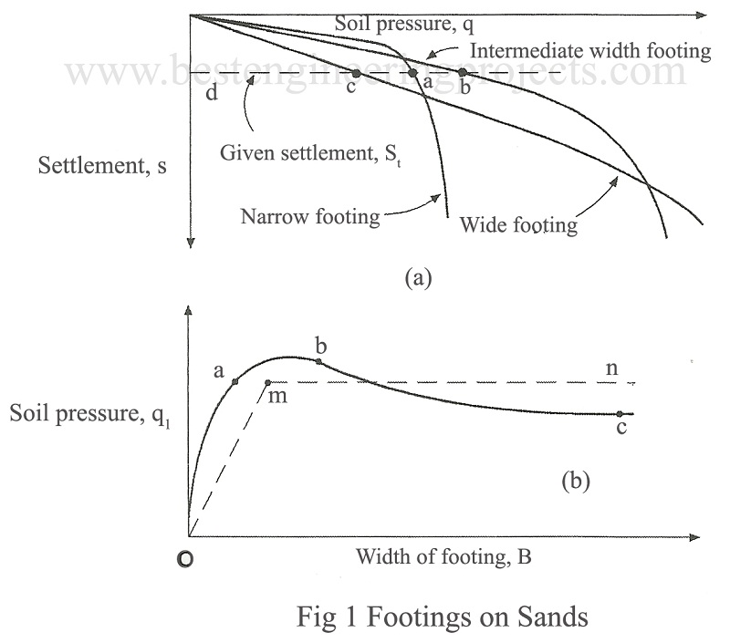 Typical load settlement relationships for footings of increasing sizes resting on a homogeneous deposit of sand of certain relative density are shown in Fig.1 above.