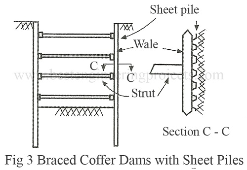 Braced Cofferdams With sheet piles Sheet Piles – The sheet piles are driven prior to excavation to the proposed depth as shown in Fig.3. As excavation progresses wales and struts are installed. The excavation is continued and another set of wales and struts are installed.