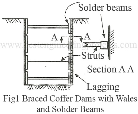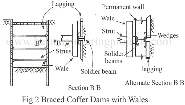 Braced Cofferdams With wales and without sheet piles – They are constructed of soldier beams driven prior to any excavation. Laggings are placed between the soldier beams as the excavation proceeds. Wales and struts are installed as soon as the excavation reaches the level of each tier. This construction is used in deep excavation. The soldier beams provide stability of the system & prevent bottom heave. Soldier beams are sometimes left in place and used as support of the permanent wall as shown in Fig.2.