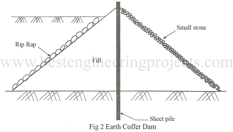 Earth embankment is suitable for high head of water and low water velocity. The side slopes of the embankment should be 1:3 to 1:4. The slope of the bank is covered by a rip rap. A typical earth embankment cofferdam is shown in Fig.2. A successful cofferdam need not be completely watertight. For reasons of economy, some seepage of water into the excavation is usually tolerated. The water collected is pumped out of the excavation. The embankment is provided with a minimum of free board of 1 m to prevent overtopping by waves.