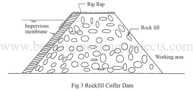 This type of cofferdam is made of rockfill. A typical section rockfill cofferdam is shown in Fig.3.