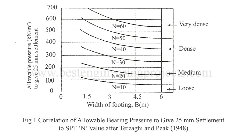 Terzaghi and Peck (1948) were the first to propose a correlation between the N (corrected SPT) Value and allowed pressure, by presenting a relationship between the size of a footing, the N (corrected SPT) value, and the applied pressure to give a settlement of 25 mm for a deep ground water table, This correlation is shown in Fig.1 below.