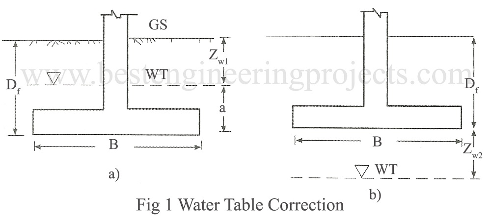 The weight of soil below water table is reduced due to buoyancy. The influence of water table on bearing capacity is incorporated in the general bearing capacity equation with the help of Fig.1.