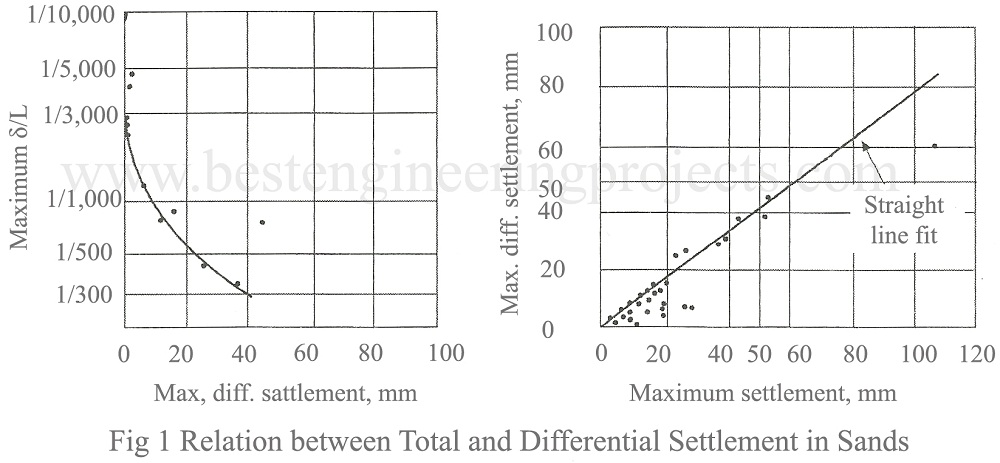 Based on actual observations on buildings Bjerrurn (1963) has provided some relationships between total and differential settlement for sands and clay.