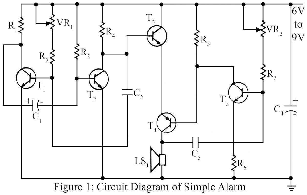 The “Simple Warning Alarm” circuit, demonstrated in Figure 1, employs a configuration of four NPN transistors along with a single PNP transistor. Specifically, NPN Transistors T1 and T2 collaborate to form a low-frequency astable multivibrator. By manipulating the setting of the variable resistor VR1, the frequency of this multivibrator can be finely adjusted within a range spanning from 1 Hz to 10 Hz.
