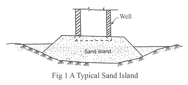 In dry ground excavate up to 50 cm in river bed and place the cutting edge at the required position. If the curb is to be laid under water and depth of water is greater than 5 m, prepare Sand Island and lay the curb. If depth of water exceeds 5 m built curb in dry ground and float it to the site. A typical sand island is shown in Fig.1 below.