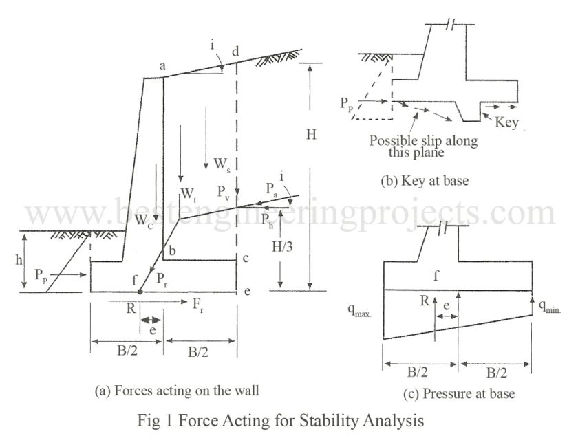 If V is the resultant of all the vertical forces acting at f with an eccentricity e as shown in Fig.1(c). The pressure distribution at the base is trapezoidal with a maximum at toe and minimum at heel.