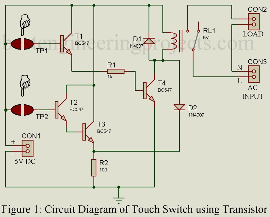 The circuit of the touch switch is shown in figure 1. This circuit is designed using four general-purpose low-power NPN transistors. Transistors T2 and T3 are configured in the Darlington pair. As the input resistance of the circuit is high and also this type of circuit requires high current gain thus we used the Darlington pair transistor.
