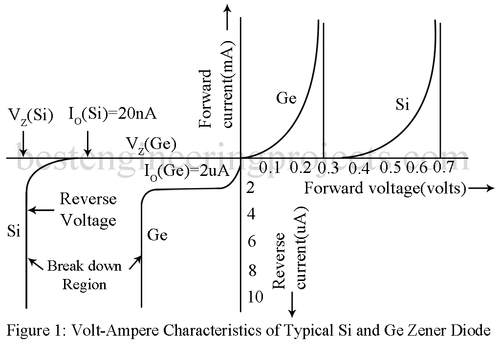 Figure 1 gives the volt-ampere characteristics of typical silicon and germanium zener diodes. Breakdown diode is operated over the breakdown region and the current is limited by an external resistance. The breakdown voltage VZ may be suitably selected by proper choice of doping level.