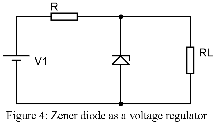 Figure 4 gives the circuit using zener diode for providing a constant voltage VZ across load positive RL in-spite of variation in input voltage Vi or load resistance RL. the source voltage Vi and the load resistor RL are so selected that the diode operates in the breakdown region. From figure 4 we find that the voltage VZ across the diode is also the voltage across the load resistor RL and it undergoes very small change in-spite of variation in source voltage Vi or the load current. In fact the zener diode maintains the output voltage VZ constant by adjusting the diode current IZ itself so as to permit a constant load current through RL.